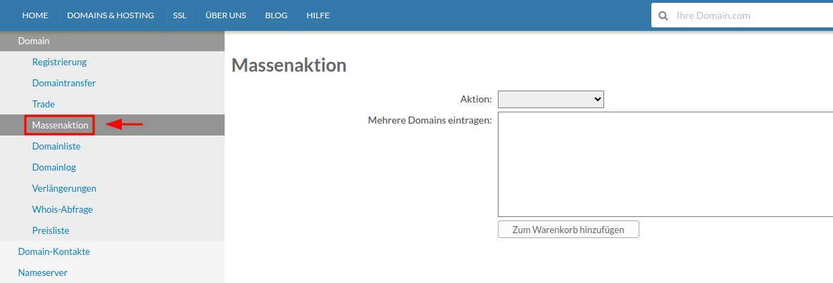 Der Menüpunkt Massenaktion bietet den Vorteil, dass eine größere Anzahl von Domains bequem mit copy & paste in das Textfeld eingefügt werden kann, z.B. aus einer CSV Datei, die Sie vorher aus der Domainliste exportiert haben.